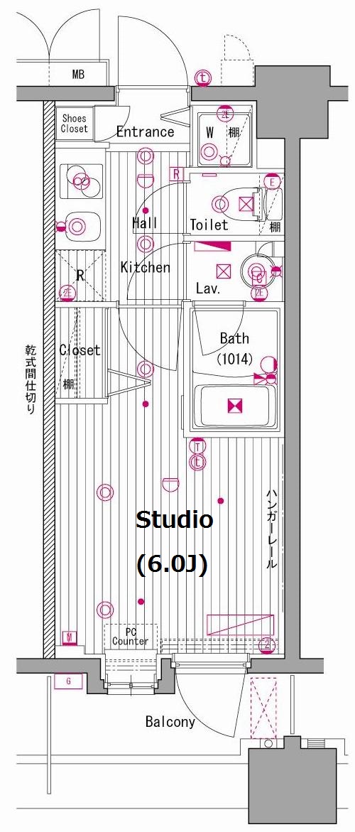 | 設備 | エアコン/独立洗面化粧台/シャワー付きトイレ/ハンズフリーカラーモニター付インターホン/システムキッチン2口ガスコンロ/PCカウンター付/浴室乾燥機/人感センサー付き玄関照明 オートロック(カメラ付)/ゴミ置場(24時間ゴミ出し可)/宅配BOX/エレベータ2基/メールボックス/24時間オンライン監視システム/インターネット光(使用料無料)/カードキーシステム |
